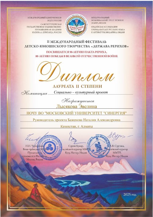 Социально-культурный проект Эвелины Лысяковой ("Московский университет Синергия", г. Алматы, Казахстан) "Память, Подвиг, Культура", посвященный творчеству выдающейся казахстанской художницы Ботагоз Нурпеисовой (1959 - 2022 гг.), получил диплом II степени на II Международном фестивале детско-юношеского творчества "Держава Рерихов" (2025 г.).