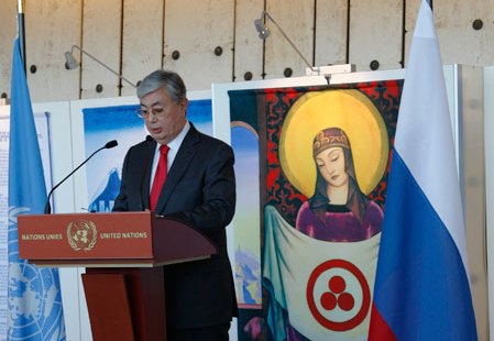 «…Великий художник и гуманист Николай Рерих ещё в 1935 году учредил это знамя — Знамя Мира. С тех пор произошло многое, но Знамя Мира все так же реет над нашей планетой. И для меня, искренне вам скажу, великая честь, что вы передаёте это Знамя мне. Думаю, что это оценка той политики, которая проводится в Казахстане, и того, с какими помыслами живёт наш народ» (2).