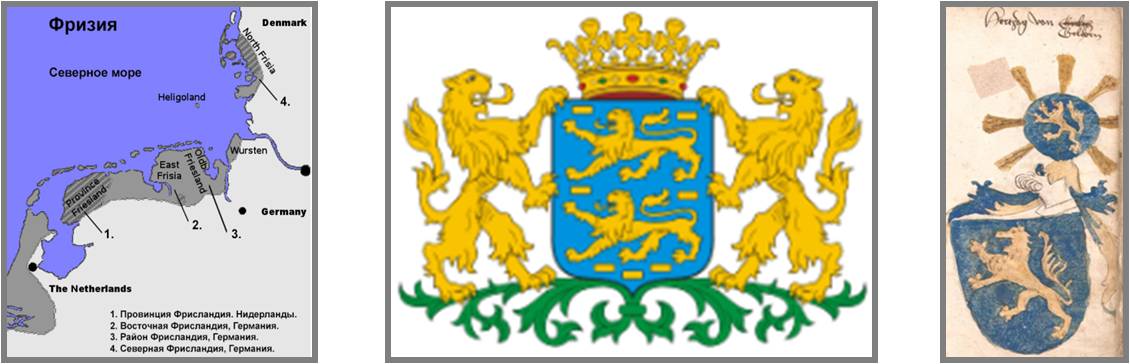 Далее, мы обратились к землям Фризии, расположенным вдоль побережья Северного моря на европейском континенте времен маркграфа Рорика. Сегодня они относятся к Нидерландам (Голландии), Германии и Дании. На севере Нидерландов находится Западная Фризия, ныне провинция Фрисландия (Province Friesland). Ее герб известен с XIV века, и его создание приписывают графам Гелдерн, тогдашним владельцам земель, имевшим золотого льва на синем фоне.